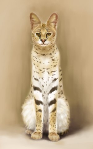 困ったのは白の麿眉の表現で、実は猫でこういった配色の眉毛模様と言うのはまず見かけない。白地に黒の眉毛模様ならあるにはあるが、これはおそらくハチワレと呼ばれる黒白猫の変種であると思われるので(そのため漢数字の八の字のような眉毛模様が多い)、白と黒が逆転するということはないだろうと思います。(黒地に白覆面をかぶったような模様の猫はいないということです。)