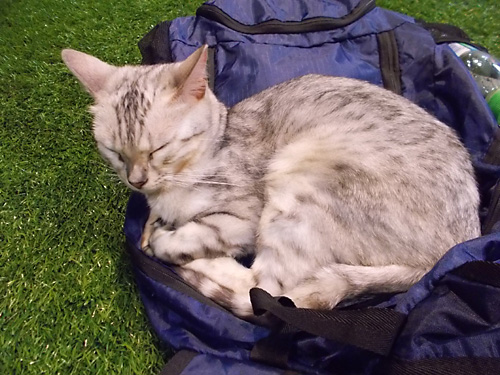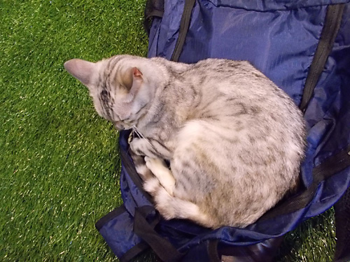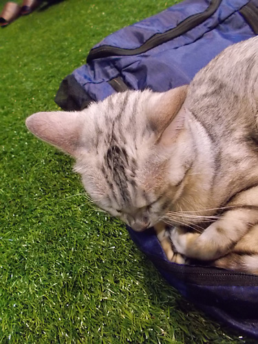しかし、おねむの伏見ちゃんを 猫ベッド リュックからどかすことができず、店員さんに泣きつく破目に。