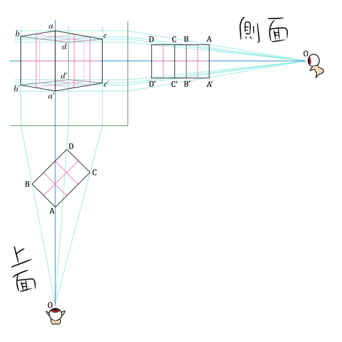 図のABB'A'が正面図に相当する正方形、ACC'A'が側面図に相当する長方形である。