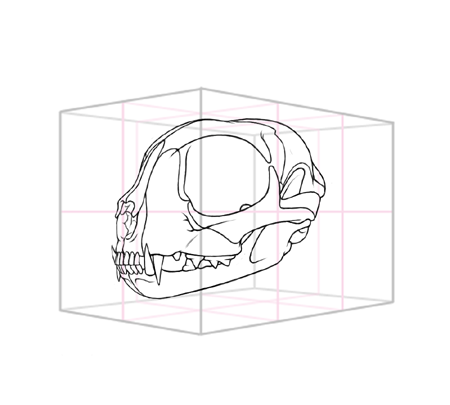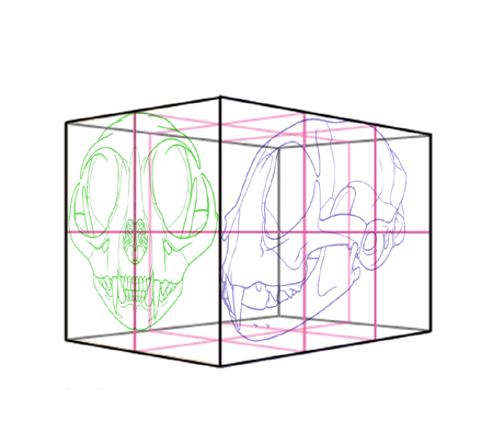 さて斜め前から見た猫の頭蓋骨の2点透視図をどう描くかだが、とりあえず正面図と側面図を基準フレームのパースに合わせて貼り付けてみた。