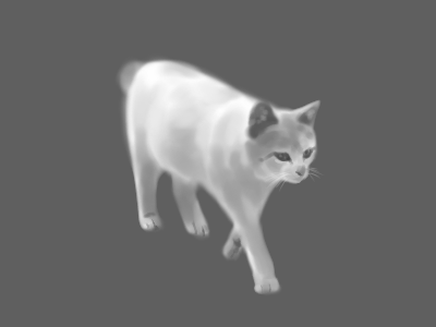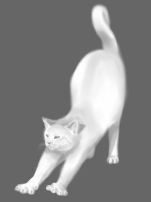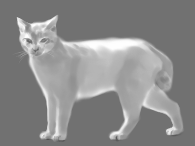 以前にゃーにゃでテストした時もそうだったが、モノクロ面塗りだと1点に30分程度はかかる。線描のほうが速いのは速いが、猫の体の立体構造を把握する練習にはあまり適当でないので、手法としては面塗り法を採用。