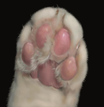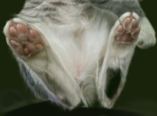 前脚と同様、指の間は閉じた状態がデフォで、意識して動かさないと指は広がらない。指の長さが短めなのは同じだが、指の間の水かき状の膜は前脚のと比べると控えめなようだ。猫は後脚で獲物を捕まえることは通常ないため、小型の獲物を逃さないためのフェンスとしての膜は必要ないのだろう。