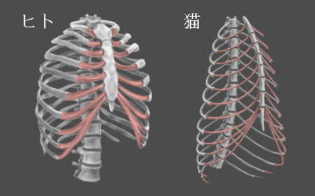 ヒトと猫の胸郭(赤は肋軟骨)。縮尺は同率ではありません。