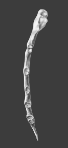 それでも最初は個別の骨の具体的な構造がわからず、適当にごまかした部分も多かったんですが、その後の調べでだいぶ判明したので、原画サイズではそれなりにディテールを描きこんであります(表示しているのはブログ用に縮小済み)。