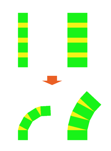 椎間板と椎骨の高さが同じで、直径が倍の差がある脊柱のモデルを考えます。それぞれを一方に曲げてみるわけですが、伸ばす側の椎間板(黄色)の長さは変わらないものとし、縮む側は隣り合う椎骨(黄緑色)が干渉するまで曲げるものとします。