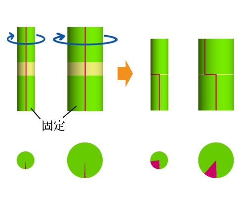 同じく直径のみ倍異なる背骨を考えます。椎間板(黄色)は伸縮自在ですが、側面の赤い縦線の、トータルの長さは変わらないものとします。